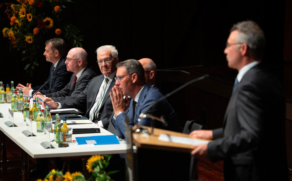 Meine sehr geehrten Damen und Herren! Wenn man sich den Süden unserer Republik auf der Landkarte anschaut, sieht man sofort: Rheinland-Pfalz, Hessen und Bayern grenzen an ein echtes Wunder, nämlich an Baden-Württemberg. Wer Badener und Schwaben, aber auch viele andere Menschen aus der ganzen Welt zusammenführen und mit ihnen gemeinsam Heimat gestalten kann, muss schon etwas ganz Besonderes sein. Etwas, auf das wir stolz sein können und auch stolz sind: Ein Land mit unverwechselbaren Landschaften, pulsierenden Städten und vitalen Dörfern. Ein Land, in dem Tüftlergeist und Fleiß auf Heimatsinn und Weltoffenheit treffen. Und nicht zuletzt ein Land, das seinen auch wirtschaftlichen Erfolg in erster Linie den Menschen verdankt, die hier leben und arbeiten.
