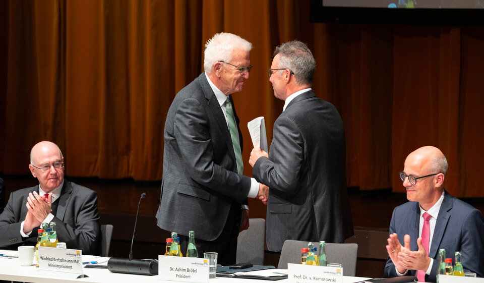 Aber nicht nur für Sie, lieber Herr Ministerpräsident, ist das heute die letzte amtsmäßige Landkreisversammlung, sondern auch für unseren langjährigen Präsidenten und jetzigen Ehrenpräsidenten Joachim Walter. Ich werde nachher zwar noch Gelegenheit haben, sein erfolgreiches Wirken für die Landkreise ausdrücklich zu würdigen. Gleichwohl drängt es mich aber, schon an dieser Stelle auch an ihn ein insofern erstes dickes Dankeschön zu platzieren. Was die Ära Winfried Kretschmann für Baden-Württemberg war, war nämlich die Ära Joachim Walter für die baden-württembergischen Landkreise und unseren Landkreistag.